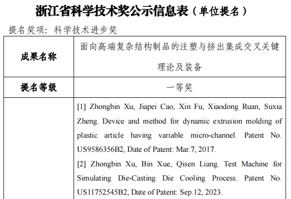 根據(jù)《浙江省科學(xué)技術(shù)廳關(guān)于開(kāi)展2023年度浙江省科學(xué)技術(shù)獎(jiǎng)提名工作的通知》有關(guān)要求,現(xiàn)將德清申達(dá)機(jī)器制造有限公司作為完成人工作單位的成果(成果名稱:面向高端復(fù)雜結(jié)構(gòu)制品的注塑與擠出集成交叉關(guān)鍵理論及裝備)相關(guān)內(nèi)容予以公示。公示時(shí)間:2024年8月9日-2024年8月15日。在公示期內(nèi)如有異議,可以來(lái)電或來(lái)信方式反映。凡匿名異議、超出期限異議的,不予受理。聯(lián)系人:金萍萍電話:13706535940電子郵箱:Jinpp@injectionmachine.com
